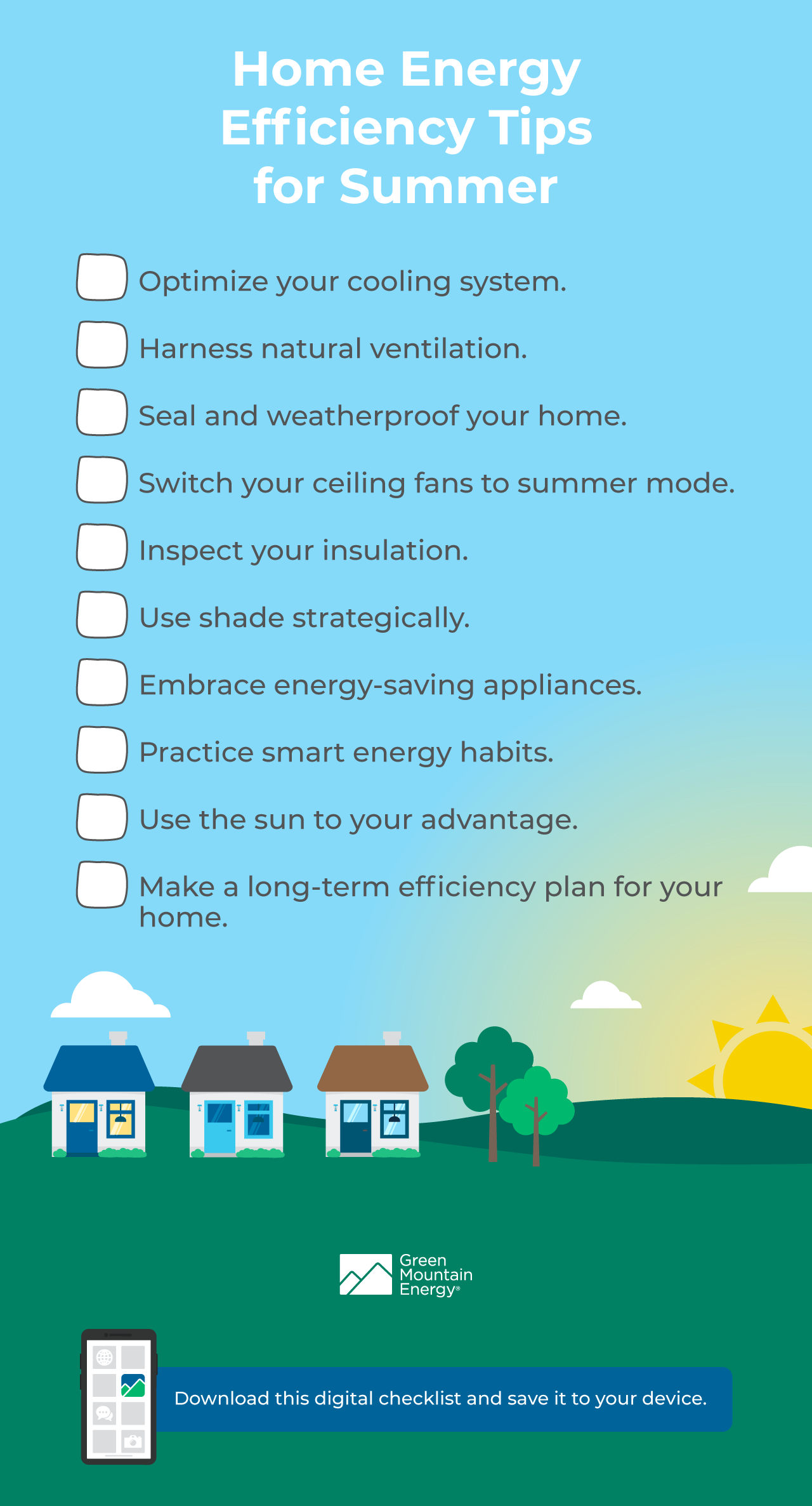 By implementing these energy efficiency tips for summer, you’ll be well-prepared for the hottest months of the year while staying comfortable and enjoying lower energy bills. To learn more about living sustainably, you can explore more resources from Green Mountain Energy. And if you’re ready to make a bigger impact this season, consider switching to a renewable energy plan and powering your home with clean energy.